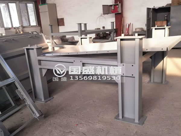 篩板材質為304條縫篩板,篩孔為5mm,采用條縫橫向布局,2臺振動電機型號為YZS-20-6,電機功率為1.5kw,篩機安裝傾角為5°,由于污泥需要進行清洗,因此脫水篩上方建議安裝沖洗管道,篩機主體和積水槽之間的材質采用帆布軟連接,沖洗管道及布料器和篩機無硬連接,支撐架的作用是為了支撐沖洗管管路及布料器,上蓋和篩機采用快開箱口。